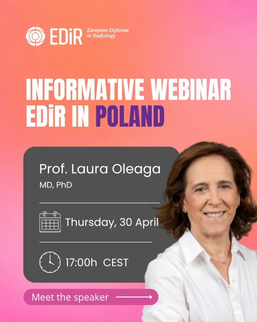 Polskie Lekarskie Towarzystwo Radiologicznie wspólnie z European Board of Radiology (EBR) organizują darmowe sesje. Najbliższe spotkanie odbędzie się 30 kwietnia 2026 r. w godz. 17:00-18:00, poprowadzi je Laura Oleaga, EDiR Scientific Director.